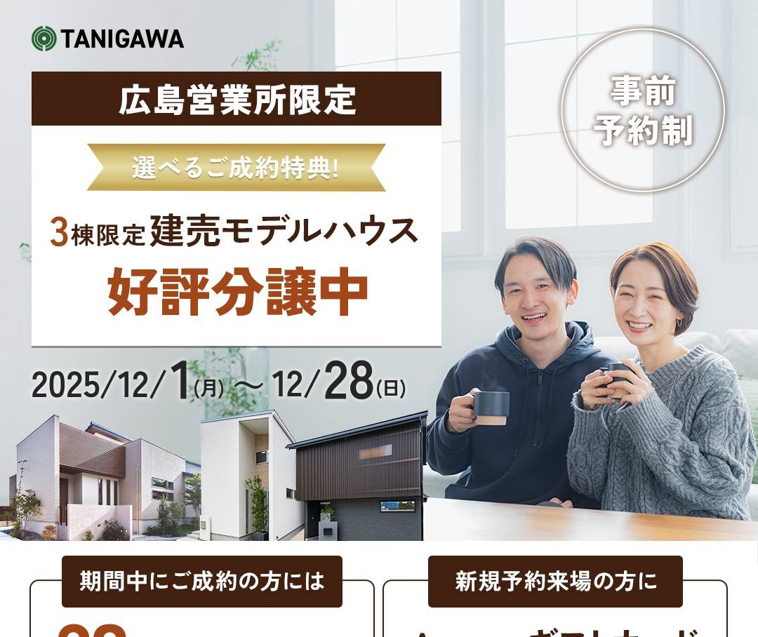 広島県 エリア選択 福岡県 長崎県 佐賀県 熊本県 大分県 鹿児島県 広島県 展示場 イベント 建売 分譲地 【広島】TANIGAWAサンタからのプレゼント!クリスマス大抽選会 開催日 2025/12/1(月)~25(木) ※火・水曜日を除く 【広島営業所限定】選べるご成約特典 限定3棟建売モデルハウス好評分譲中 開催日 2025/12/1(月)~12/28(日) 展示場 牛田情報スクエア アスタ 住所 広島県広島市東区牛田新町2丁目2-10-23 TEL 082-225-7105 受付時間 10:00~18:00 ご来場予約はこちら Home 住宅 エリア情報 広島県