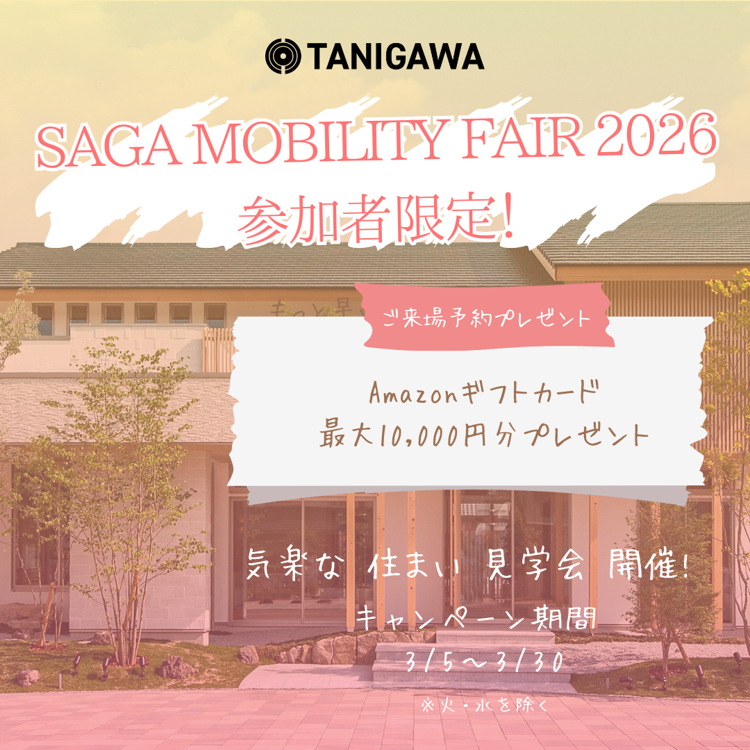 佐賀県 エリア選択 福岡県 長崎県 佐賀県 熊本県 大分県 鹿児島県 広島県 展示場 イベント 建売 分譲地 【佐賀】3棟同時平屋一斉見学会 開催日 2026年3月28日(土)・29日(日) 【佐賀】オーナー様邸見学会in佐賀市 開催日 2026年3月20日(金)・21日(土)・22日(日) 【SAGA MOBILITY FAIR 2026in佐賀参加者様限定】気楽な住まい見学会 開催日 3/5(木)~3/30(月) 【佐賀】春のリフォームフェア 開催日 2026/3/20(金)・3/21(土)・3/22(日) 【佐賀】TANIGAWAが提案する土地活用・相続対策・私的年金としての『REGIS』アパート・戸建賃貸経営 開催日 2026年1月~ 【佐賀】TANIGAWAリフォーム 開催日 2025年5月~ 展示場 SAGATVハウジングパーク PATIO 住所 佐賀県佐賀市兵庫北5丁目13-43 TEL 0952-36-7551 受付時間 10:00~18:00 ご来場予約はこちら Home 住宅 エリア情報 佐賀県