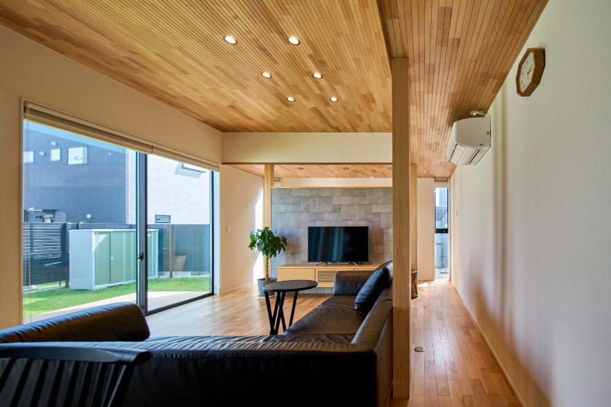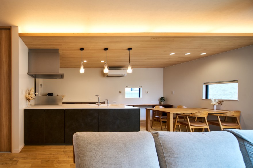 ↓天井材にひのきの無垢材を使用した、あたたかみのあるLDK。