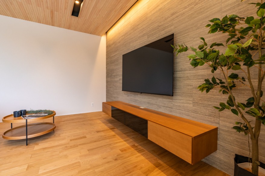 ↓テレビは壁掛けにして配線を隠しすっきりと。間接照明が空間を彩ります。