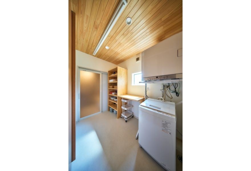 ↓3帖の洗面脱衣室。室内干しできるよう、物干しを設置。雨の日も安心です。