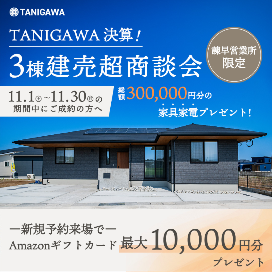 谷川建設には常に見学できる家があります。諫早・大村エリアには展示場2棟、販売中の建売が3棟あります。ネットやSNSなどさまざまな情報を得られる時代ですが、実際に見て、触って、体感して自分たちにあった家づくりをおすすめします。