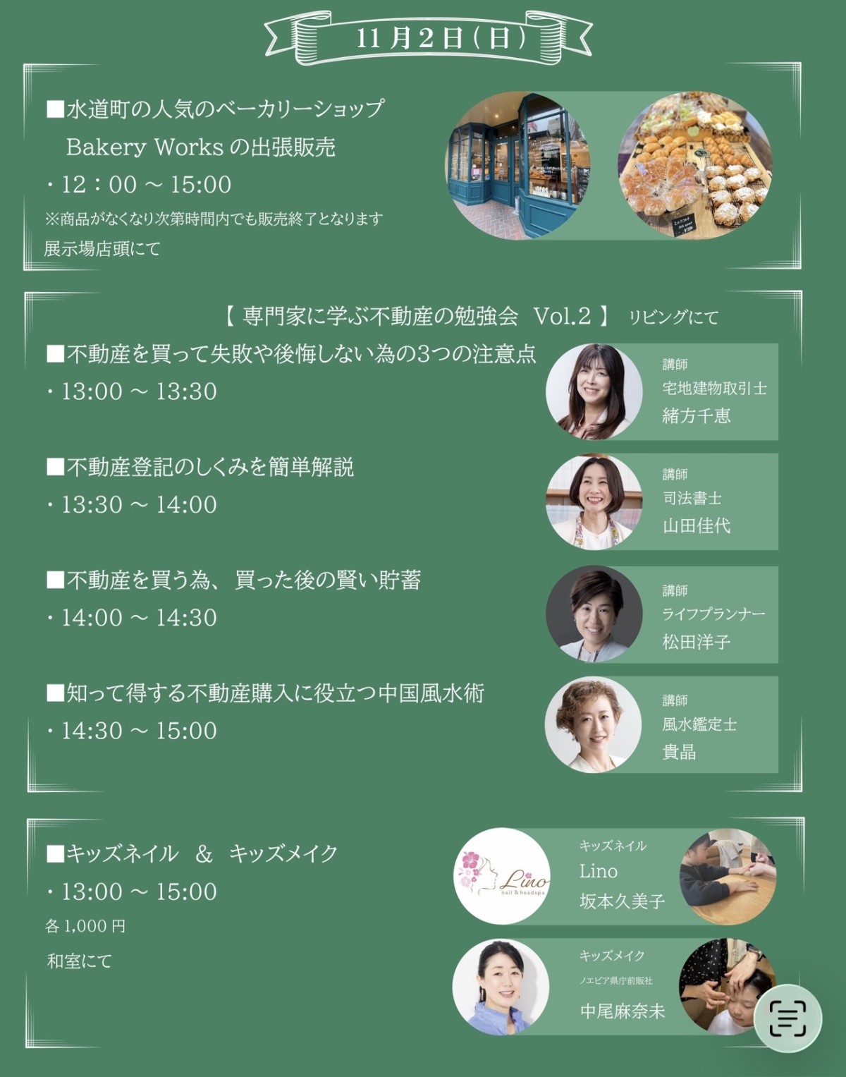 ひのき香るカンナボール作成体験や耳つぼジュエリー、水道町の人気のパン屋さんの店頭販売、そしてそれぞれの専門家をお招きしての不動産の勉強会などもりだくさんのイベントです。