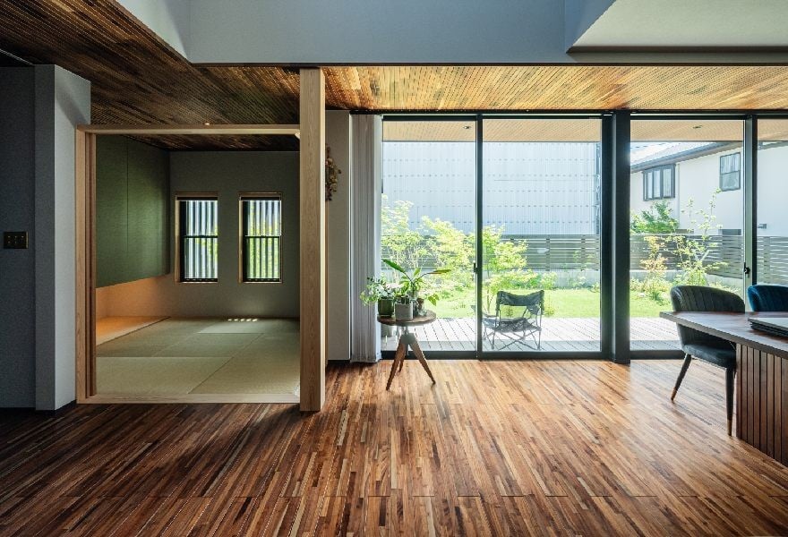↓世界三大銘木のブラックウォルナットをフローリングと勾配天井材に使用したシックなLDK。