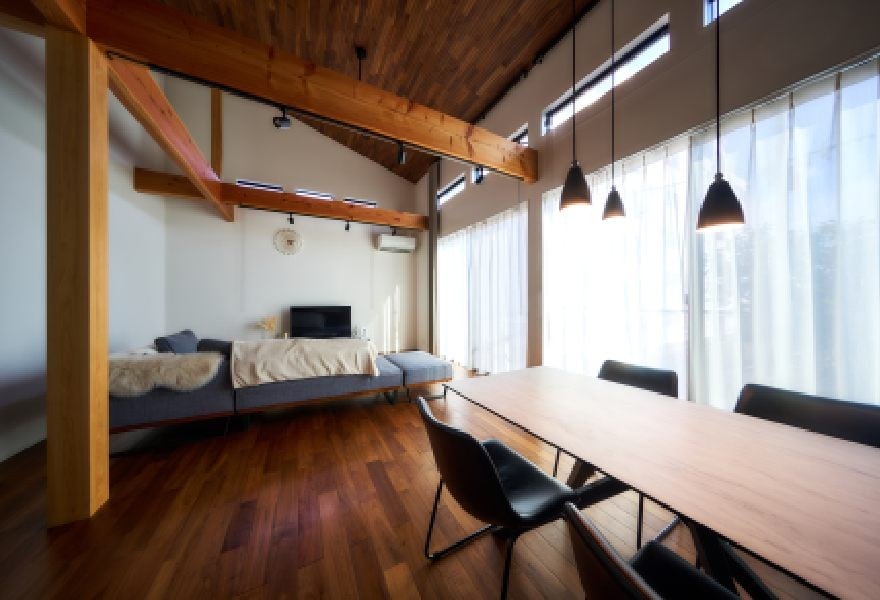 ↓吹き抜けのような解放感が欲しいけど冷暖房効率が気になる…という方におすすめ!勾配天井にして明るく開放的なリビングに。