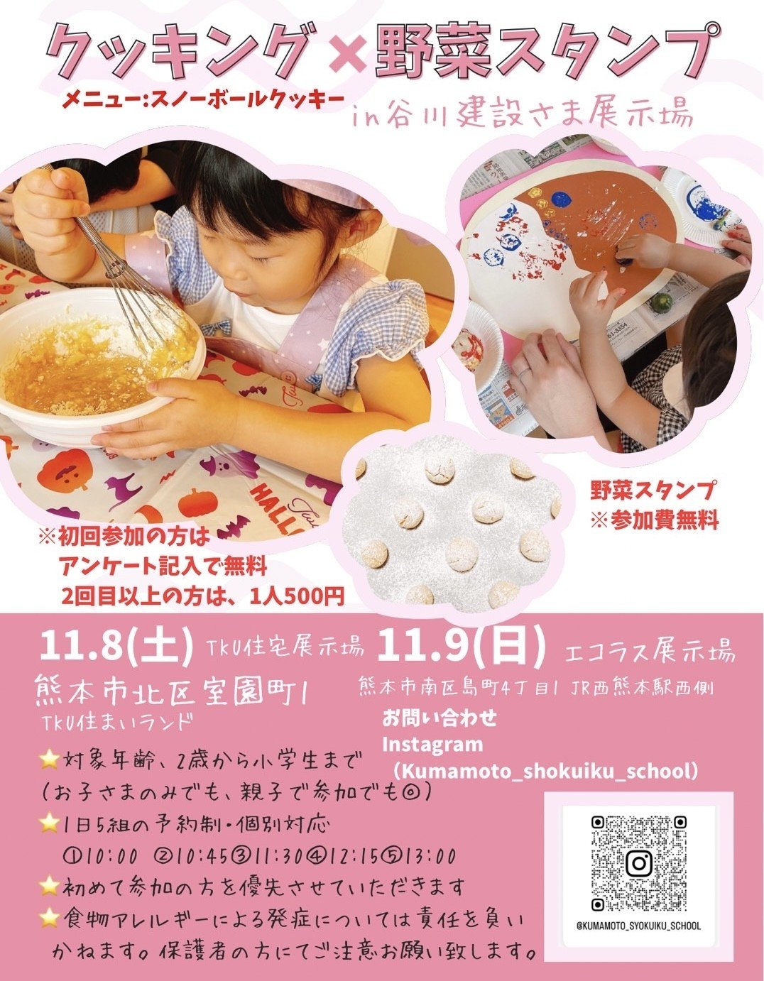 11月8日(土)TKU住宅展示場住まいランドにて、9(日)総合住宅展示場エコラスにて、「熊本食育スクール」のあいか先生による食育イベント【スノーボールクッキー親子でクッキング】×【野菜スタンプ】を同時開催いたします