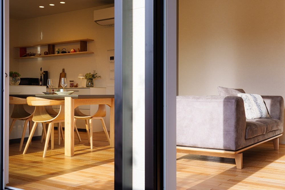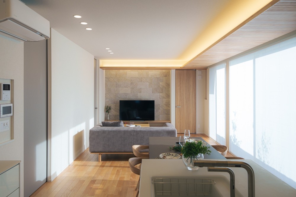 陽射しあふれるリビングは間接照明でも演出されていて、木質感をさらに際立たせます。