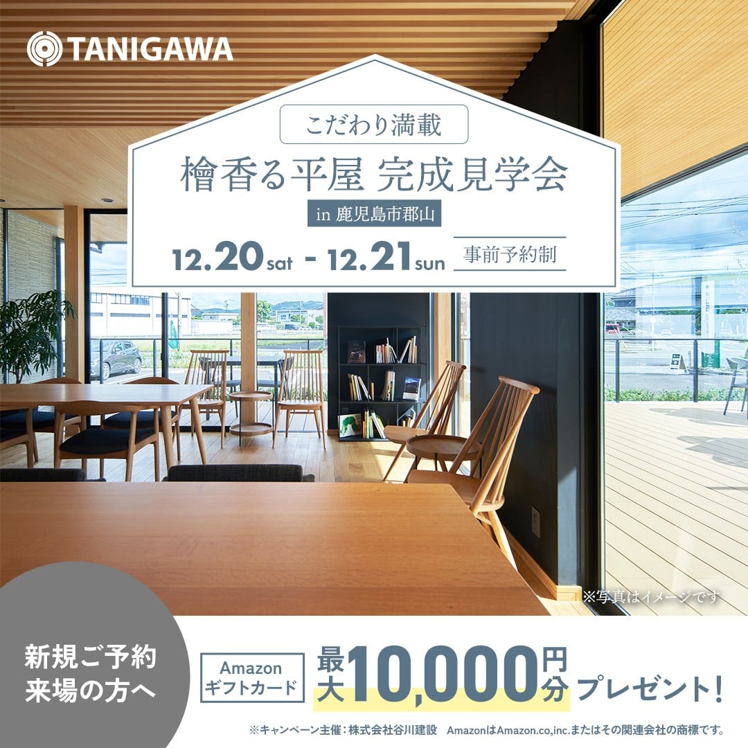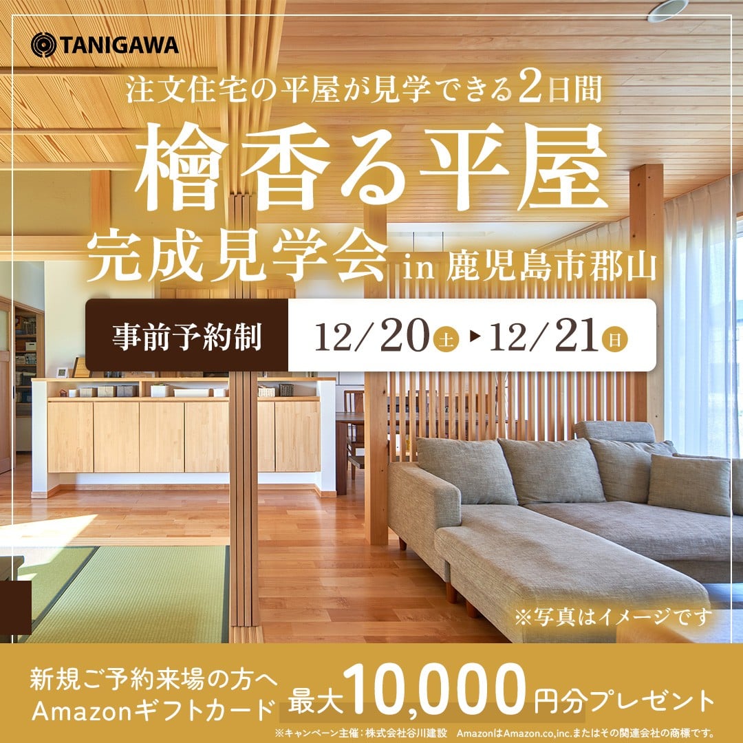 | 補足 | 事前予約制のイベントで、WEBからのご予約をおすすめしています。 当日のご予約は、御電話で。 谷川建設 鹿児島営業所 ※火・水曜日、12/29~1/4 社休 TEL 099-813-2222 |