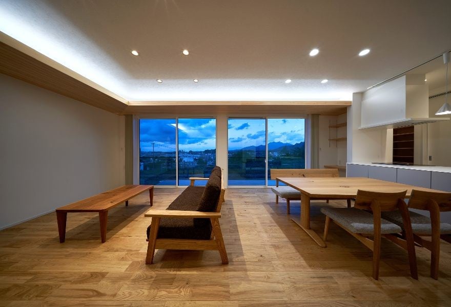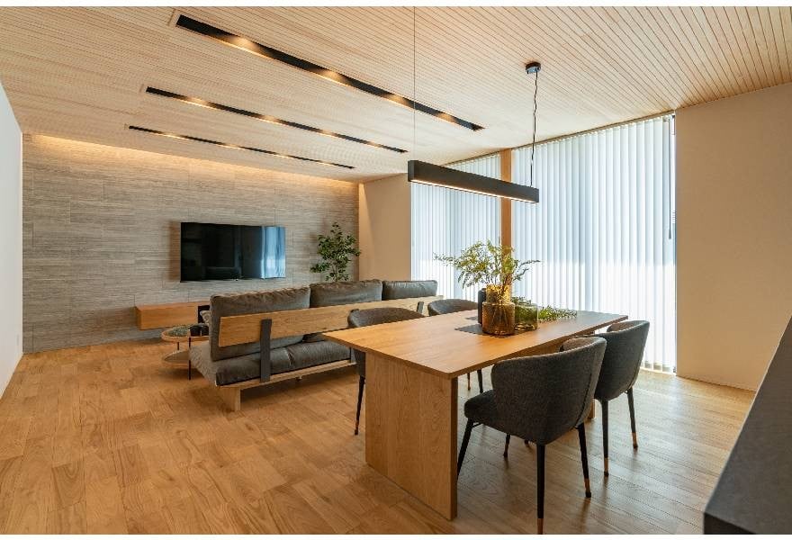 ↓21帖のLDK。床と同じ木材を下がり天井に使用。間接照明がくつろぎ空間を優しく彩ります。