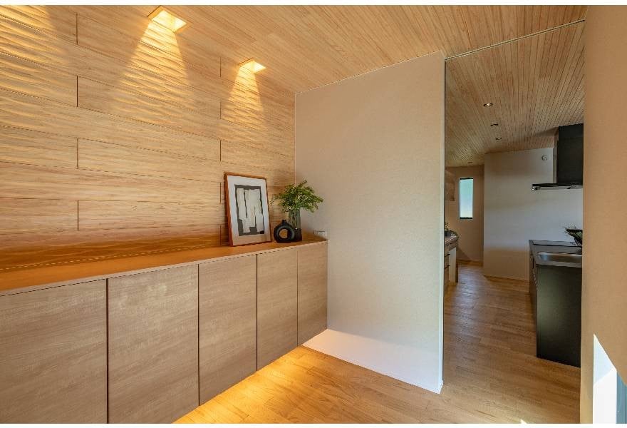 ↓玄関ドアを開けて目に入るのは檜の美しさ。照明が檜の表情を鮮やかに魅せます。