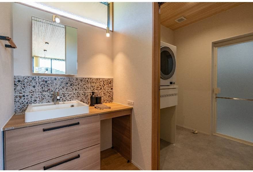 ↓まるでホテルのような洗面台。テラゾータイルがアクセントに。