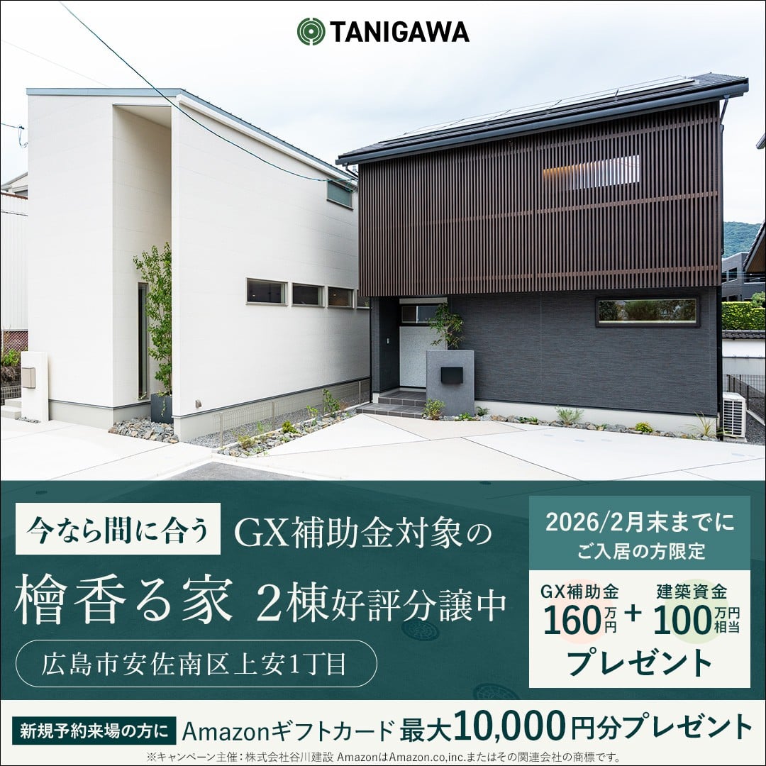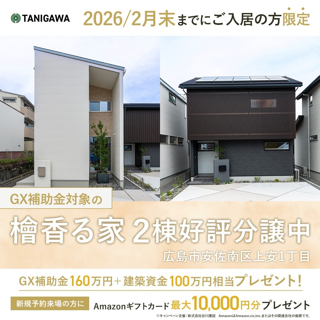 上安1丁目建売モデル(B/C号地)のみ、2026年2月末までのご入居の方に限り、★GX補助金160万円+ご建築資金100万円相当をプレゼント★