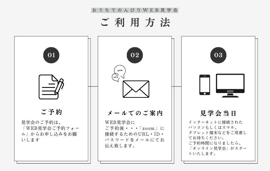 WEB見学会にご予約後、担当者より「zoom」に接続するためのURL・ID・パスワードをメールにてお伝え致します✉