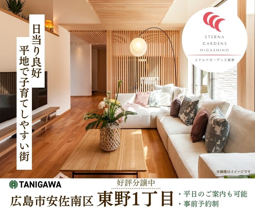 | 補足 | ①エテルナガーデンズ東野 谷川建設自社土地 東野1丁目(A号地/B号地) (詳細はご予約後担当者よりご連絡いたします) ②牛田情報スクエア アスタ TANIGAWAモデルハウス 《〒732-0068 広島県広島市東区牛田新町2丁目2-10-23》 アスタ展示場でのご説明、現地でのご案内、どちらでも承ります。 ご来場予約フォームより、お申し込みください。 ご案内当日のお申し込みはお電話にてご連絡ください。 |