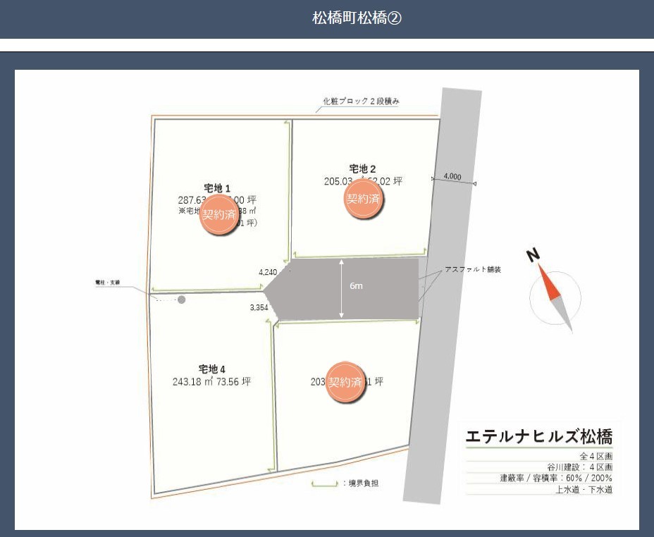 ○境界ブロック費用は買主負担 ○宅地①と宅地④の通路部分には通行地役権をお互い設定します