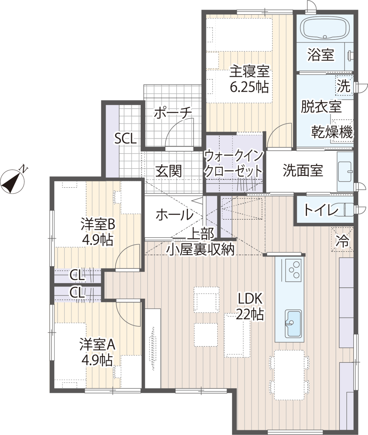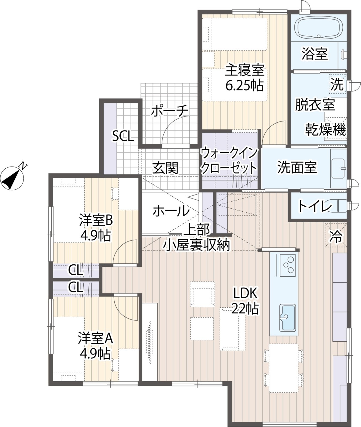 各部屋に2〜3帖のクローゼットを設け、さらに小屋裏収納もプラス。家中が片づきやすく、ライフスタイルの変化にも柔軟に対応できます。