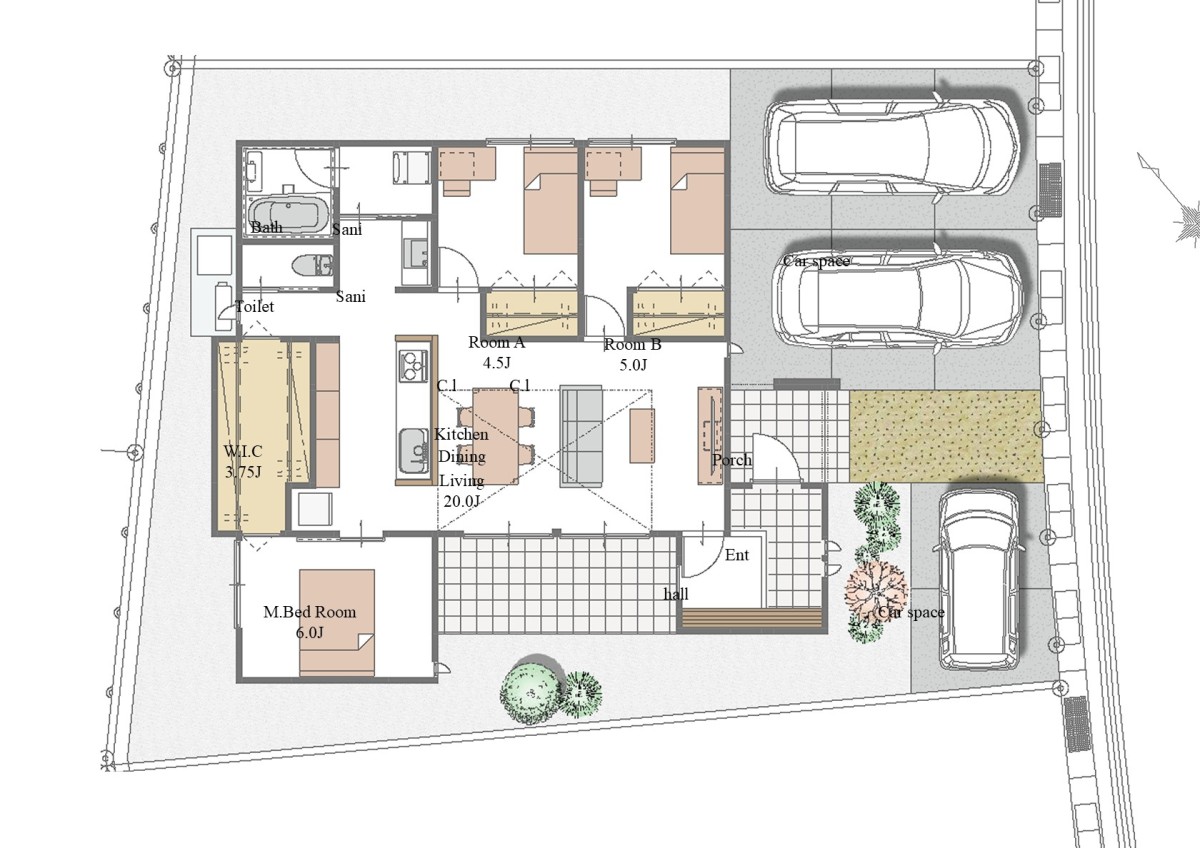 平屋 3LDK+WIC+ウッドデッキ+P3台