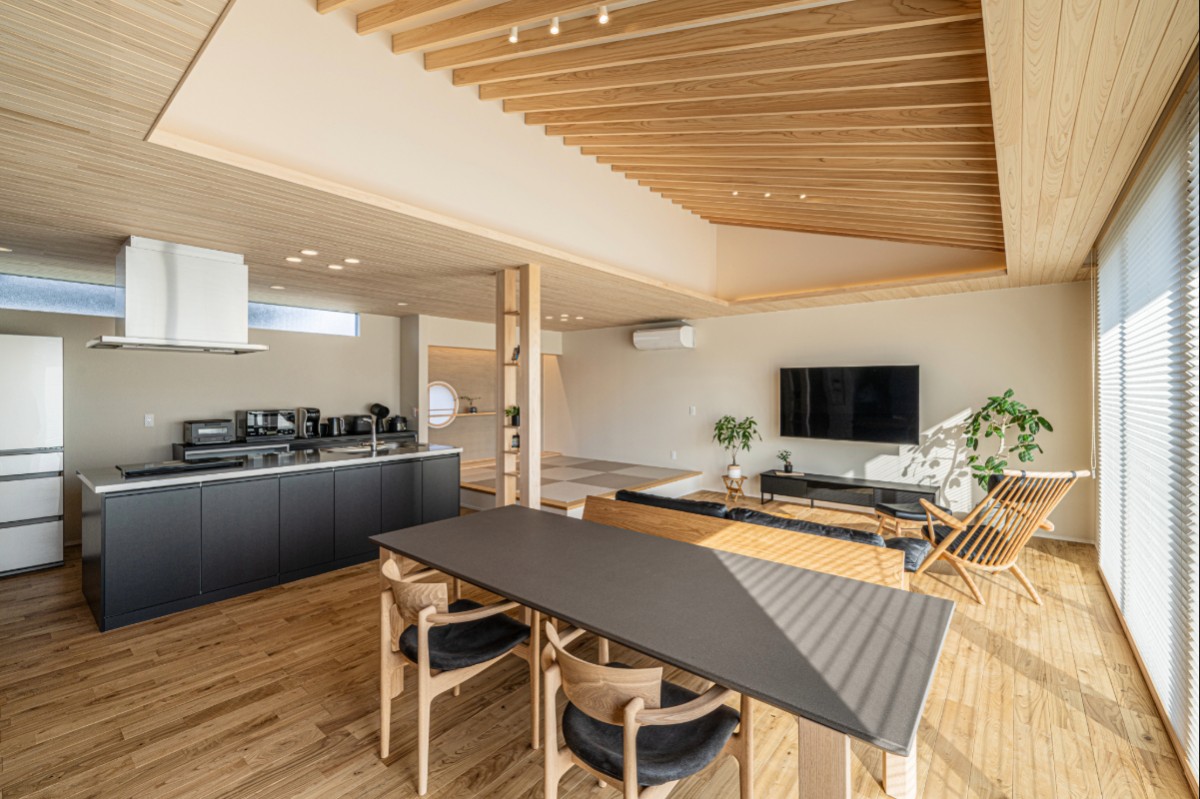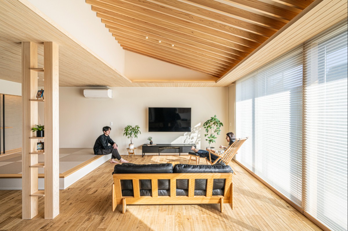 勾配天井に設えたルーバーと大開口の窓が開放感を生み、天井全体に張り巡らせた檜のリブが落ち着きと和モダンの趣を演出