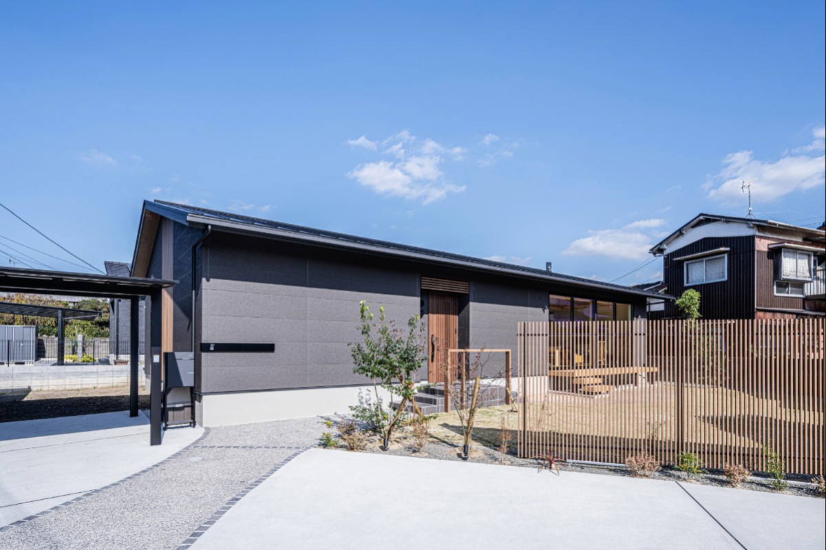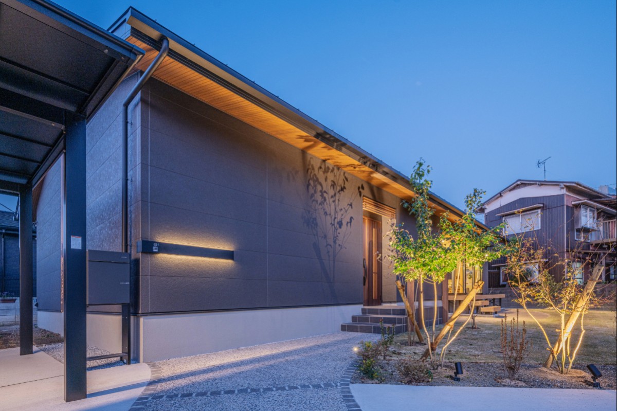 落ち着いたダークトーンの外壁に、大開口や木の格子が軽やかな表情を添え、重厚さの中にもほどよい抜け感と洗練を感じさせる。