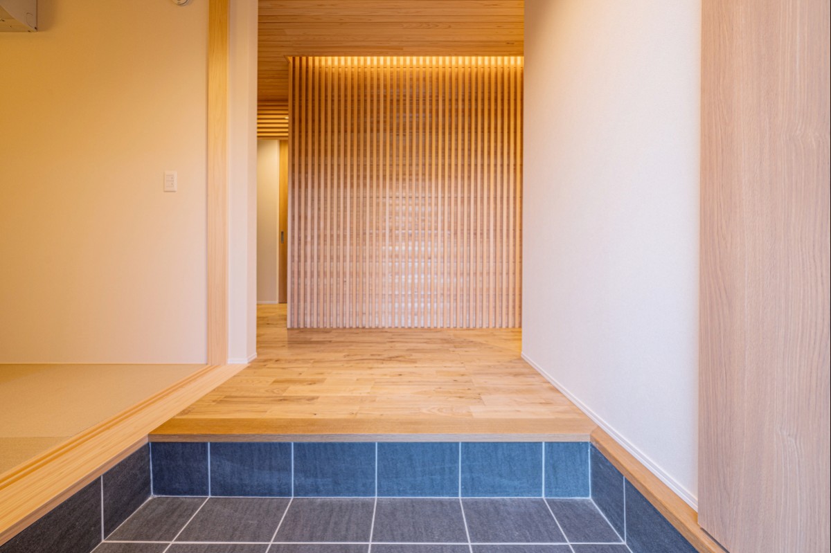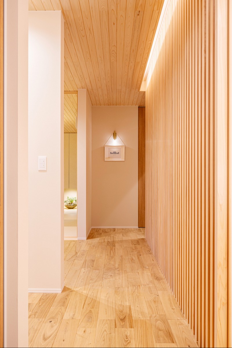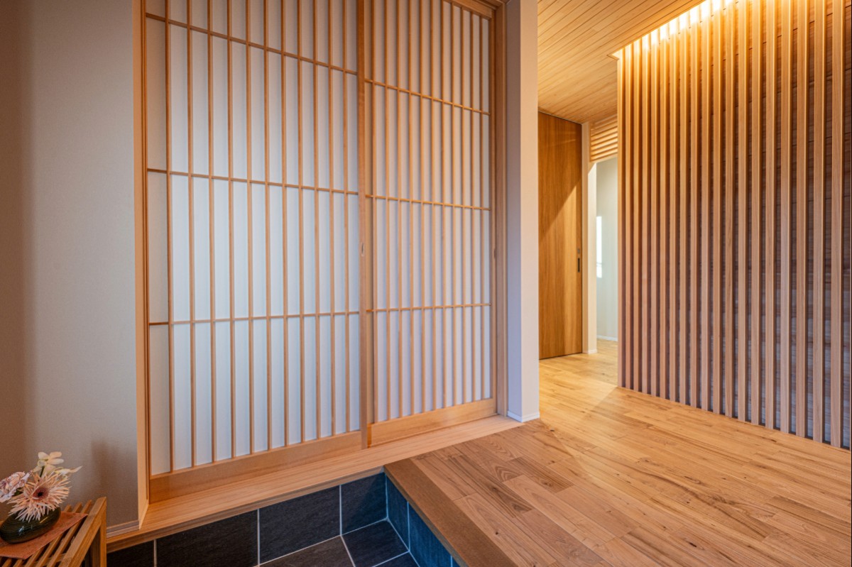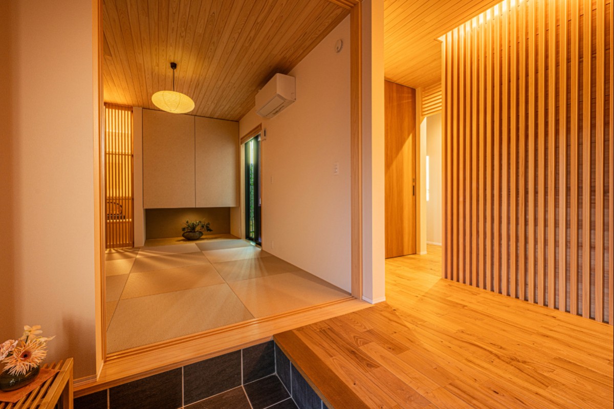 玄関ドアを開けると、檜の香りに包まれた上質な空間が広がる。