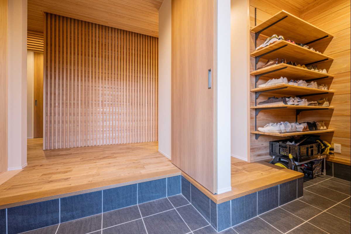 正面の格子と間接照明が静かな表情を添え、左には和室、右にはアウトドア用品も収まるSICを配置。暮らしやすさと意匠性が調和した玄関に。