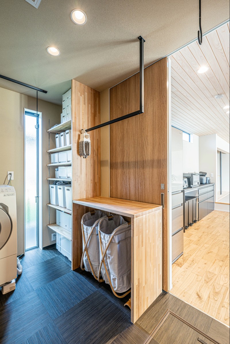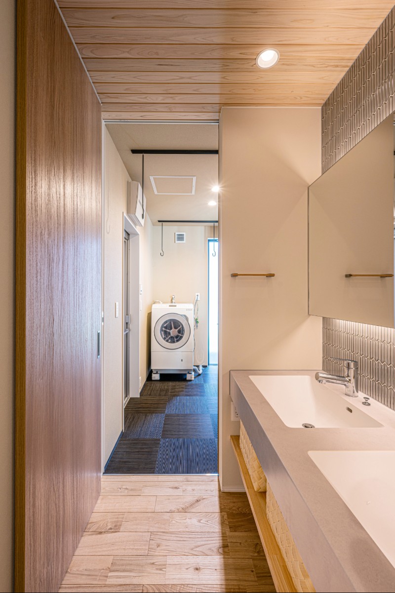 キッチンから洗濯・乾燥・収納までを一か所で完結できるランドリールーム、洗面台、さらに大容量のWICへと動線が展開。