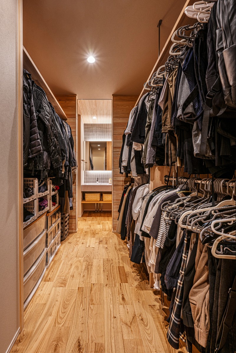 WICは玄関ホールの格子の裏に配置され、帰宅後すぐにコートや荷物を片付けられる最短動線を確保