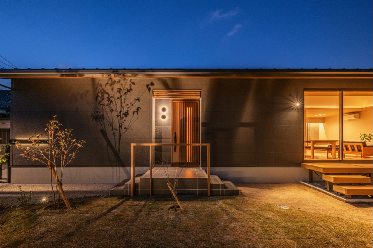 大判タイルと木製格子のコントラストが美しく、夜にはやわらかな灯りが広がる