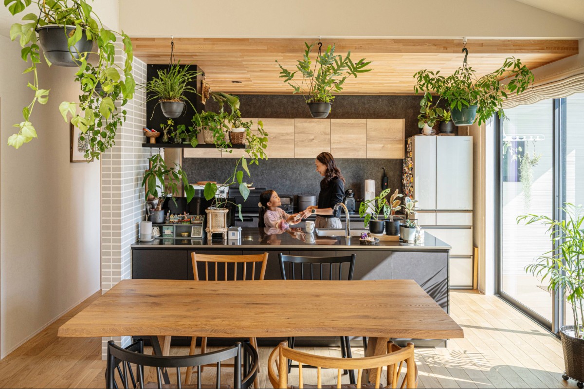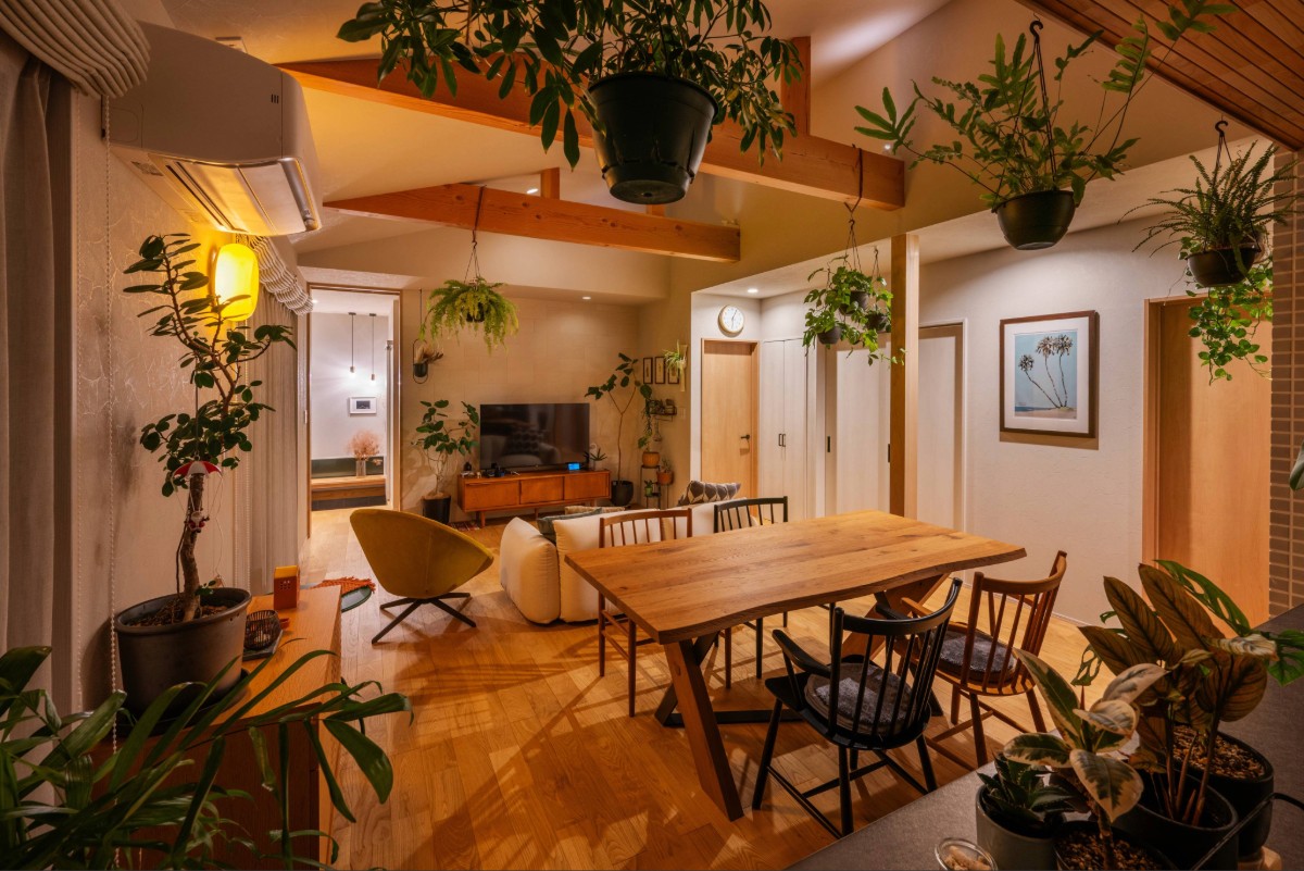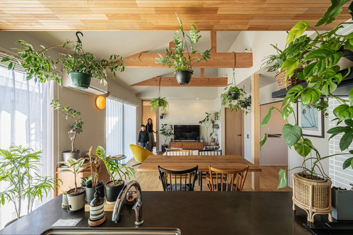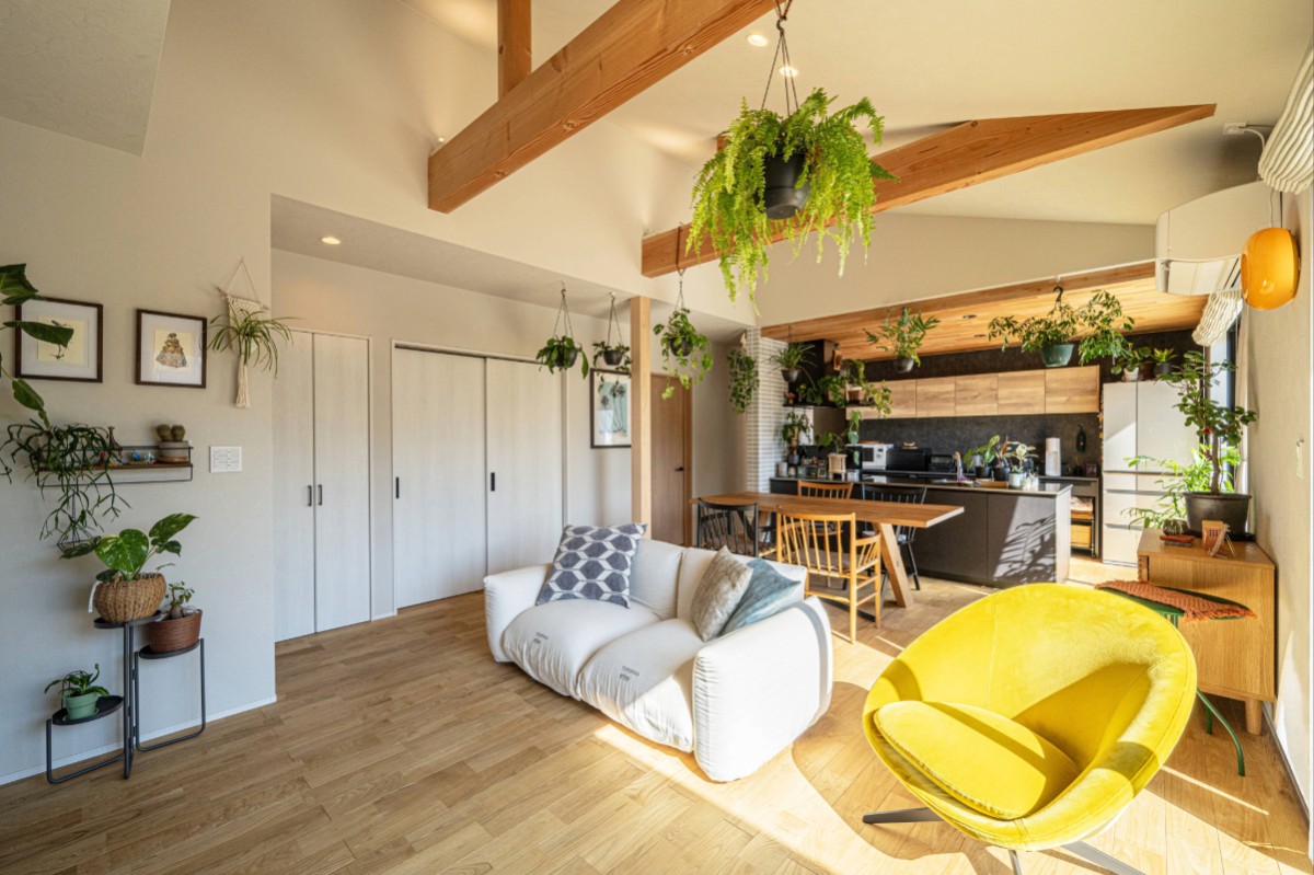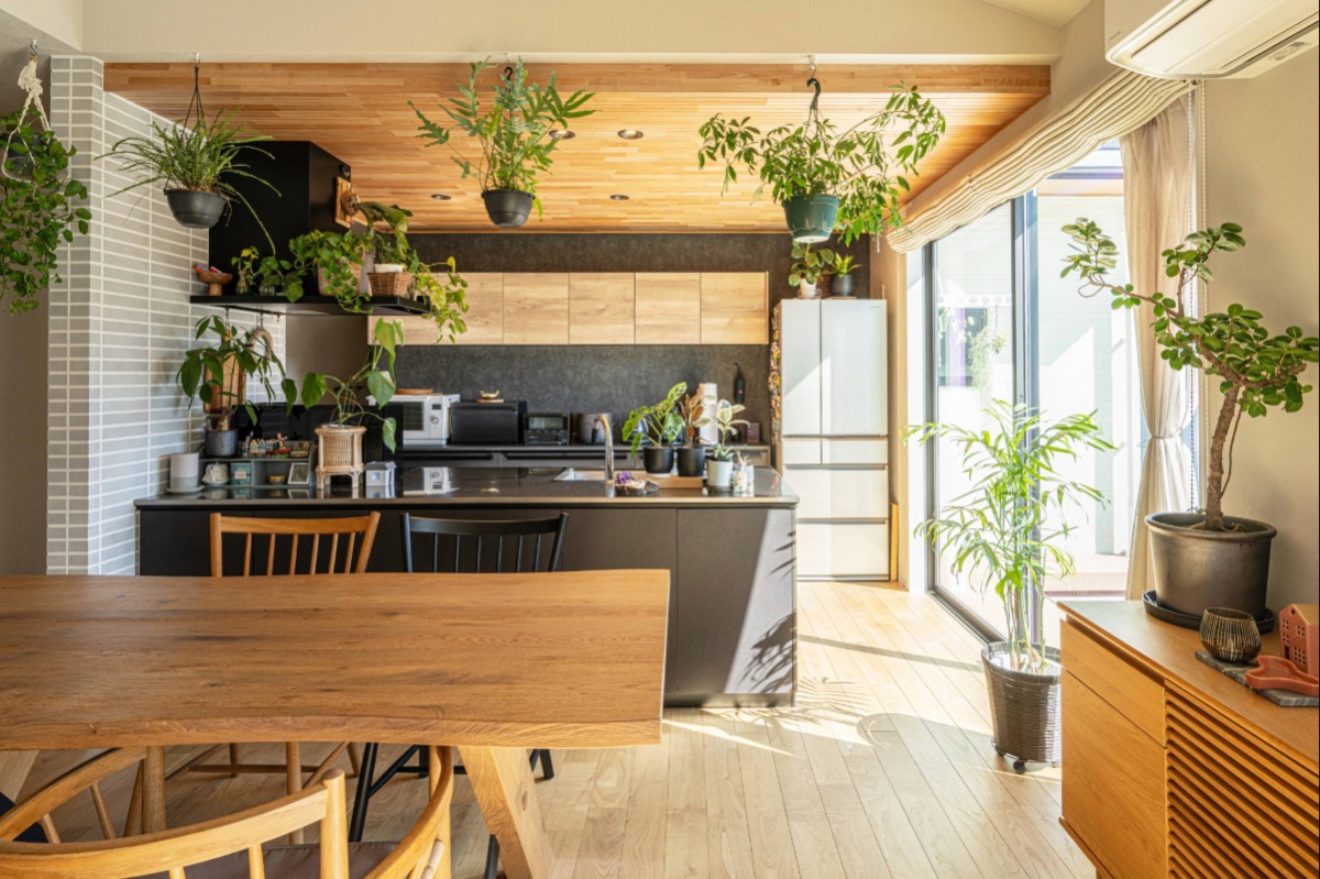 大開口から差し込む光と木の温もりが空間を包み、観葉植物が映える設えに。