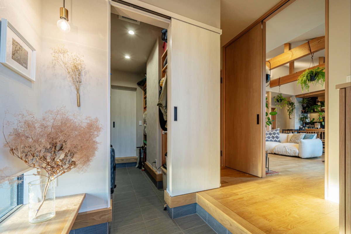 土間と無垢材の床が美しく切り替わる玄関ホール。