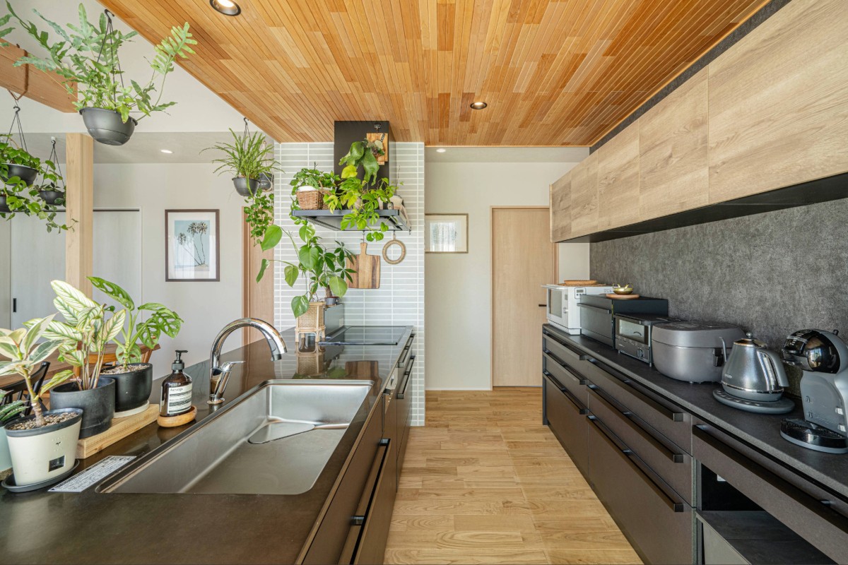 メープルのリブ天井が、木の温もりと陰影を美しく演出するキッチン。