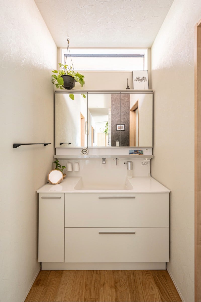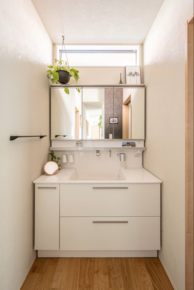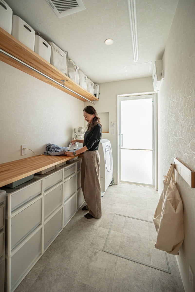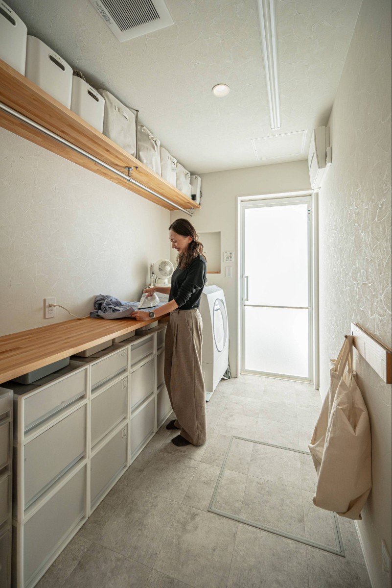 キッチン奥に集約した水回りは、洗濯から収納までを一か所で完結できる効率的な動線設計。大容量収納とカウンターを備え、家事時間を短縮。