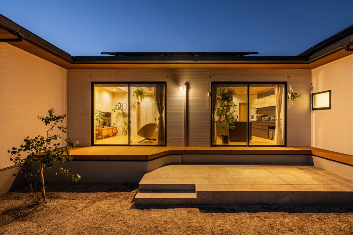 平屋ならではの安定感を備えた、シックモダンなコの字型の外観。ライトグレーの外壁と黒い屋根のコントラストが洗練された印象を与える。LDKに面した大きな開口部とウッドデッキが内と外を緩やかにつなぎ、光と心地よさを住まいに取り込む。