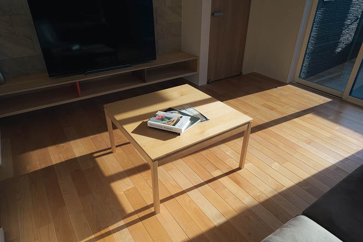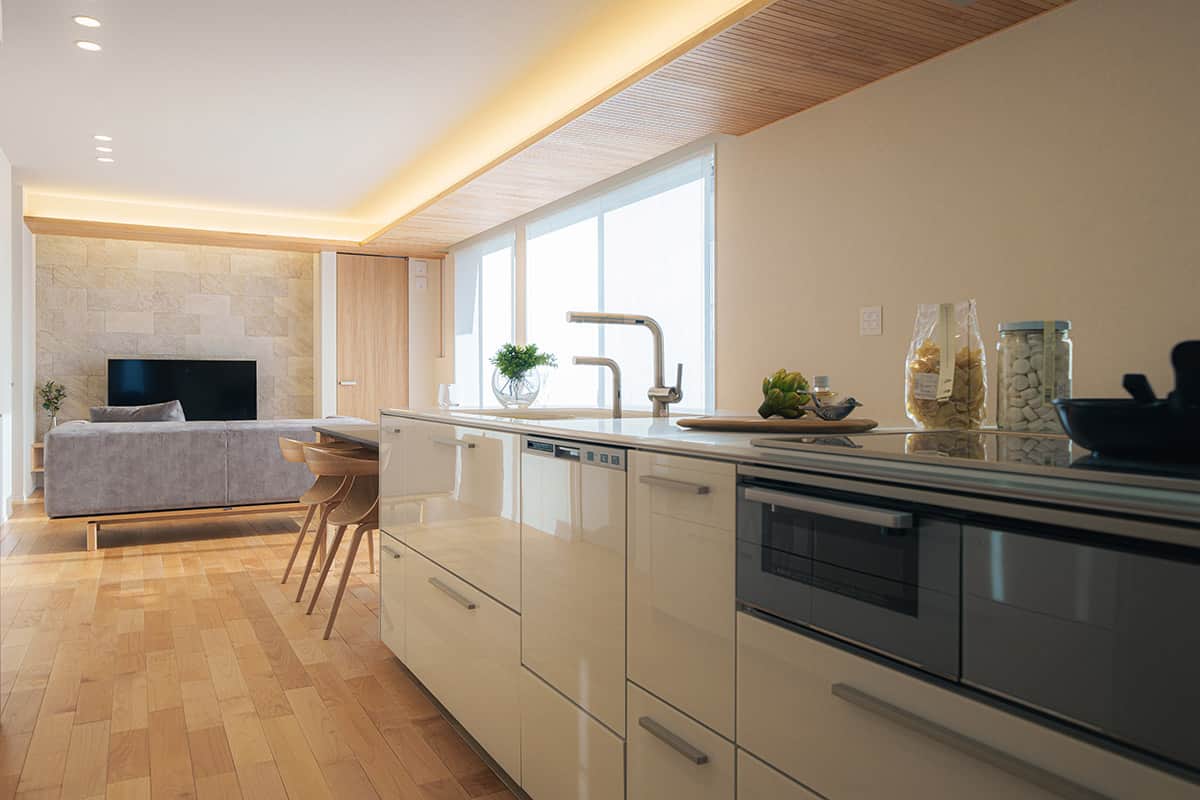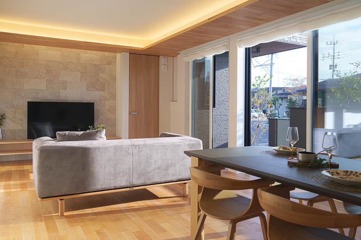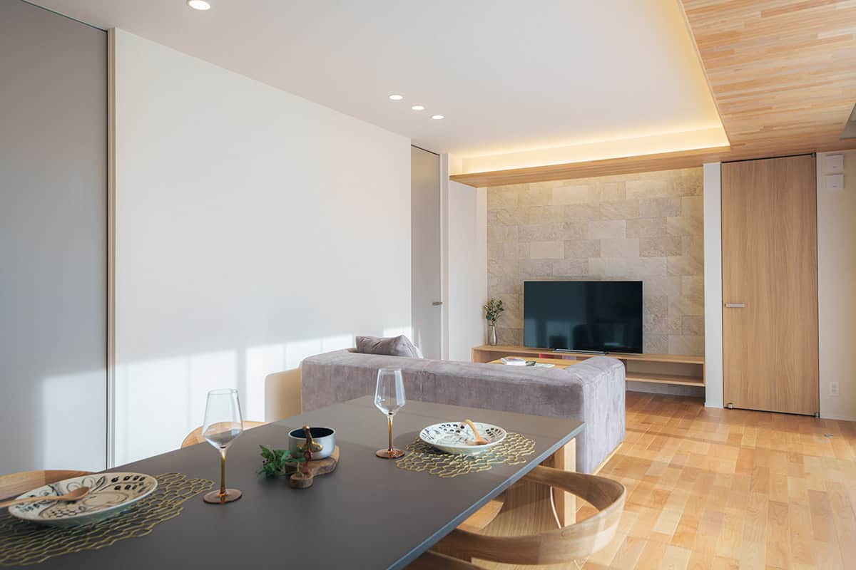 - メープル材の天井に間接照明による光の演出で奥行きと広がりを感じられる空間